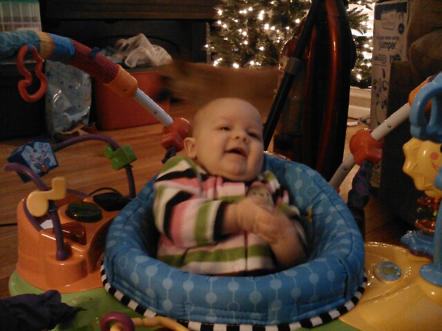 Layla got a new jumper from Santa. She isn't full force jumping yet, but she loves being upright. And, it gives her all sorts of things to try to chew on. Score one for Santa!